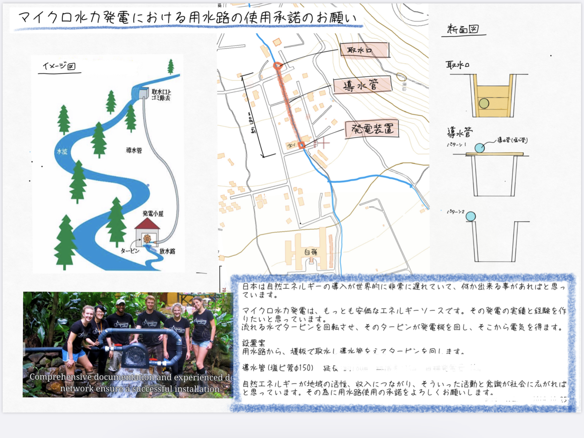裏の水路で発電をしたかったのですが、なかなかやる勇気が無かった。やれるのに、やらないのは無責任! なので、実行に移す事にしました。ボスコの敷地だけでは発電量が少ないので、水路のもっと上流からパイプを使って水圧を上げ、水車を回す計画を考えています。