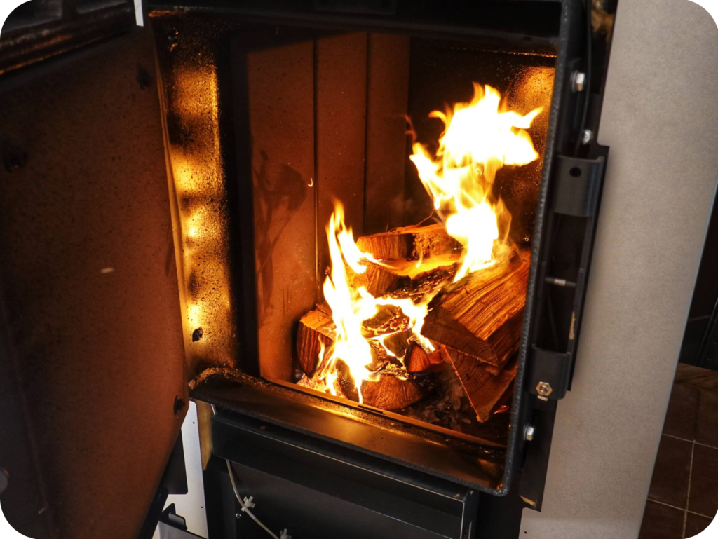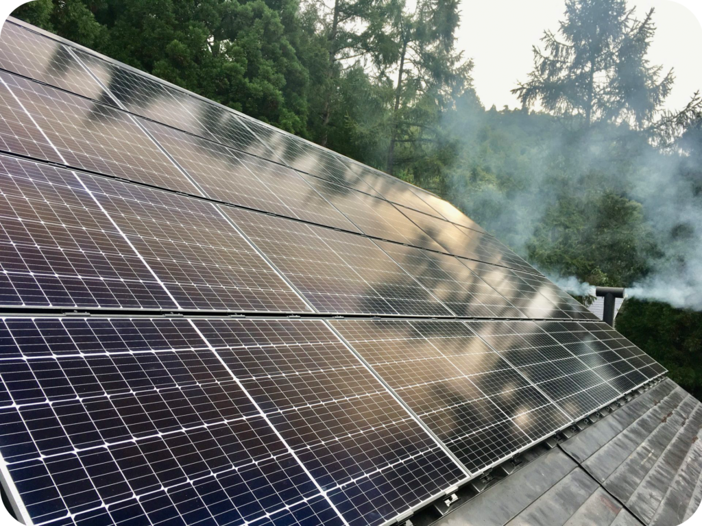 沢水を使った冷房、地域の間伐材を活用した薪ストーブ、蓄熱タンクと組み合わせた薪ボイラーによる暖房と給湯、さらに屋根のソーラーパネルによる発電など、自然の恵みを活かしたシステムを導入しています。